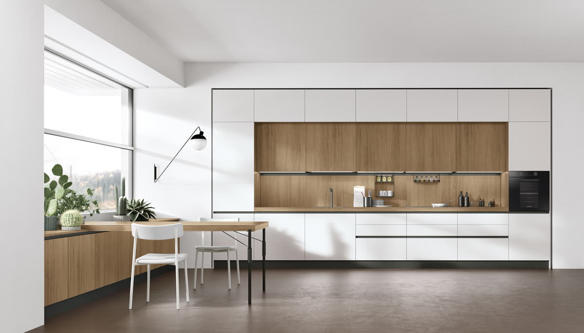 Infinity è progettata con Look System e permette di giocare con alternanze di chiari e scuri, accostamenti di colore ed essenza, cambi di volume e uso sapiente di pieni e vuoti, accogliendo elementi tecnologici che si integrano perfettamente in una cucina dalle infinite soluzioni progettuali.