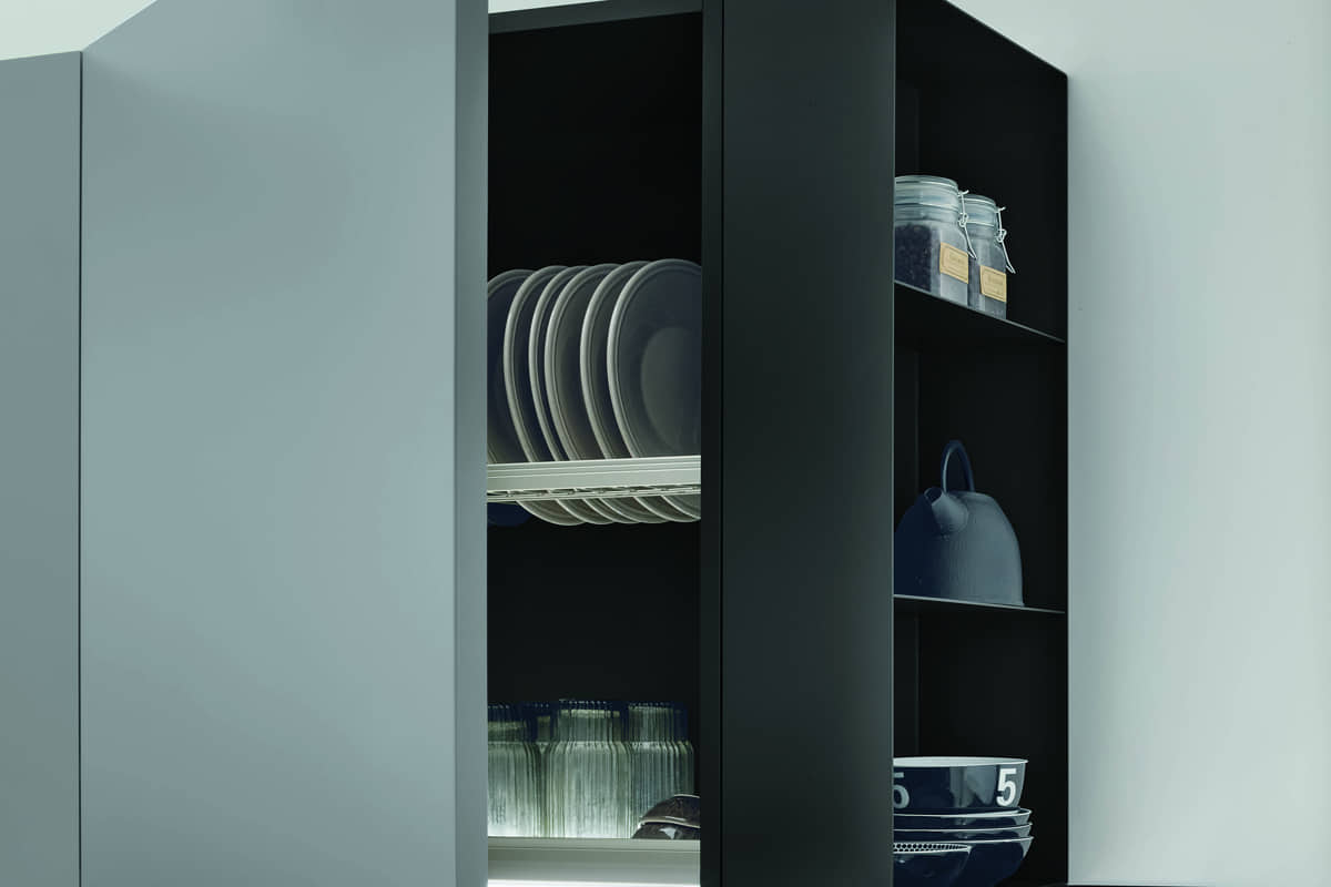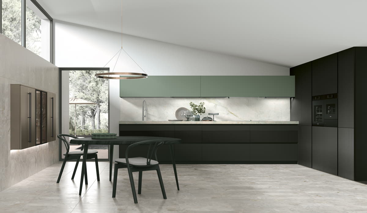 Metropolis ha spazi contenitivi ben organizzati, proposti anche con elementi larghezza 75 cm per accogliere elettrodomestici di ultima generazione come frigo e forno XXL, e moduli suddivisi in tre cassetti di altezze diverse (12 / 24 / 36 cm) la cui linearità viene sottolineata dalle gole a contrasto.